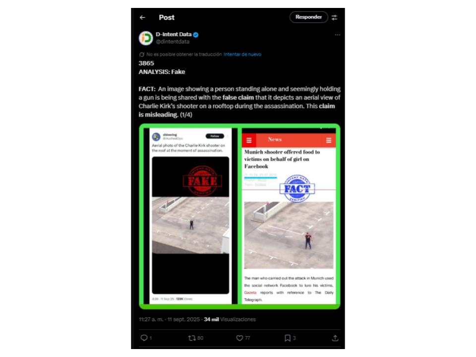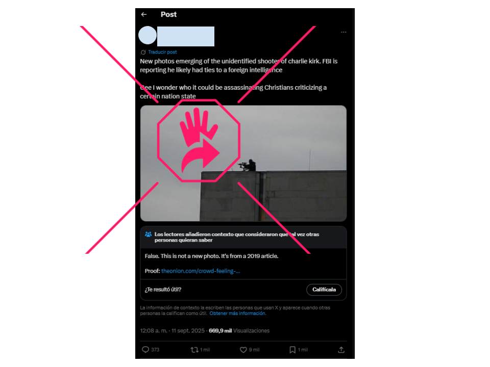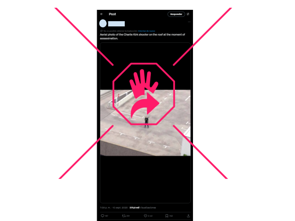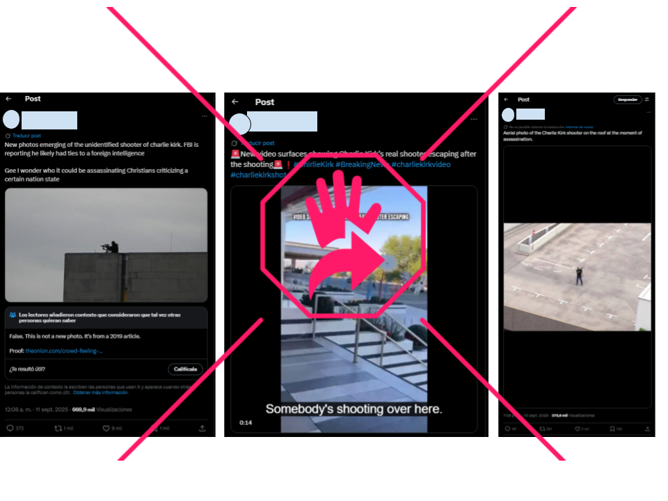 Tras el asesinato del activista conservador Charlie Kirk, circulan en redes sociales videos e imágenes que desinforman. Una grabación viralizada muestra, supuestamente, la huida del atacante, pero en realidad es un video de un pistolero de un tiroteo en un casino en Reno, Nevada, en julio de 2025. Dos imágenes sobre la supuesta localización del agresor en el techo de un edificio se han viralizado también en redes sociales, pero en realidad una muestra la versión intervenida de la foto de un hombre que produjo un tiroteo masivo en Múnich, Alemania, en 2016; y otra muestra a un hombre en la esquina del techo de un edificio, pero no es actual y no tiene nada que ver con Kirk: ilustra un artículo en una web satírica y aparece en sitios genéricos de wallpapers. Lee aquí cómo escogemos y asignamos nuestras etiquetas en elDetector.
