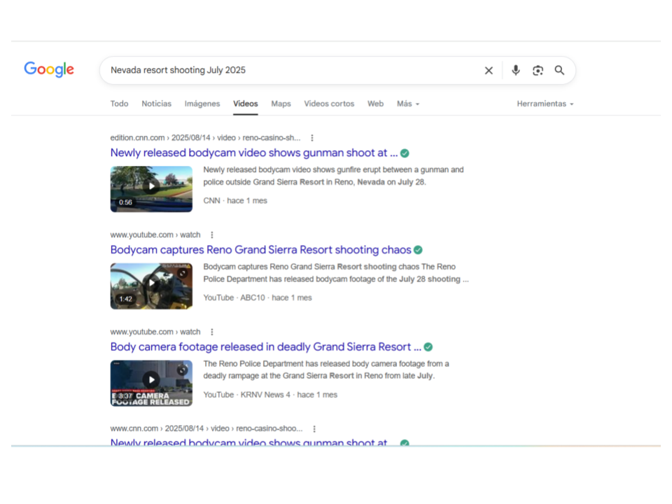 Una búsqueda con palabras clave en Google, nos confirmó que el video es de Reno, de un tiroteo en un casino, el pasado 28 de julio de 2025. En la sección de videos de Google aparece la grabación que falsamente atribuyen al atentado contra Kirk.