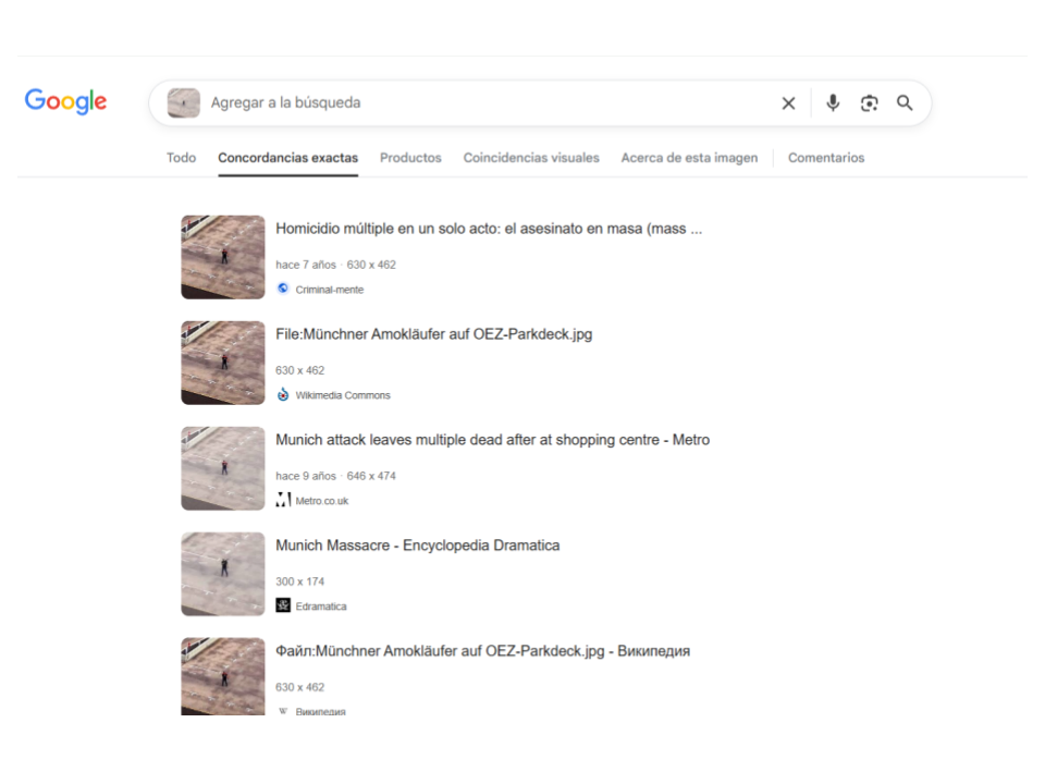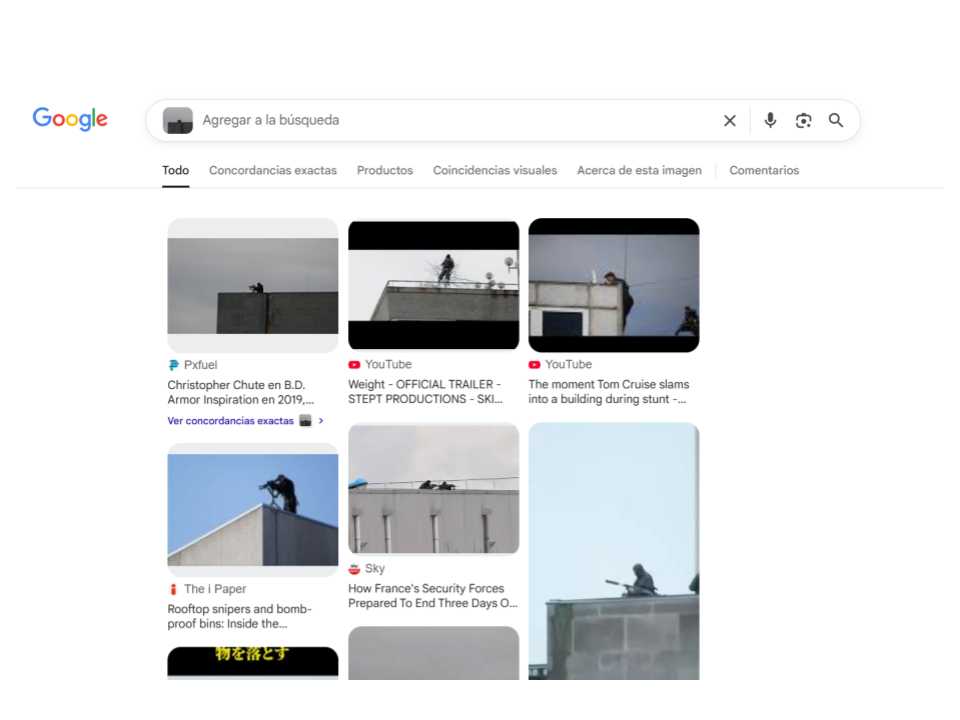 Una búsqueda inversa de imágenes en Google Lens nos llevó a distintas informaciones que apuntan a que el hombre con arma larga en el techo es un pistolero que atacó a un grupo de personas en Múnich, Alemania, en julio de 2016.