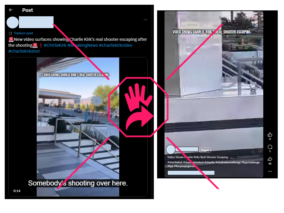 “Video muestra el escape del verdadero atacante de Charlie Kirk”, se lee, en inglés, en letras superpuestas en una grabación viralizada en X (antes Twitter) y Facebook. En el clip se ve la toma de unas escaleras grises con negro y lo que parece la salida de un edificio de paredes rocosas y barandas de cristal. Luego, un hombre blanco, de suéter negro y shorts negros sale corriendo en medio de un estacionamiento.