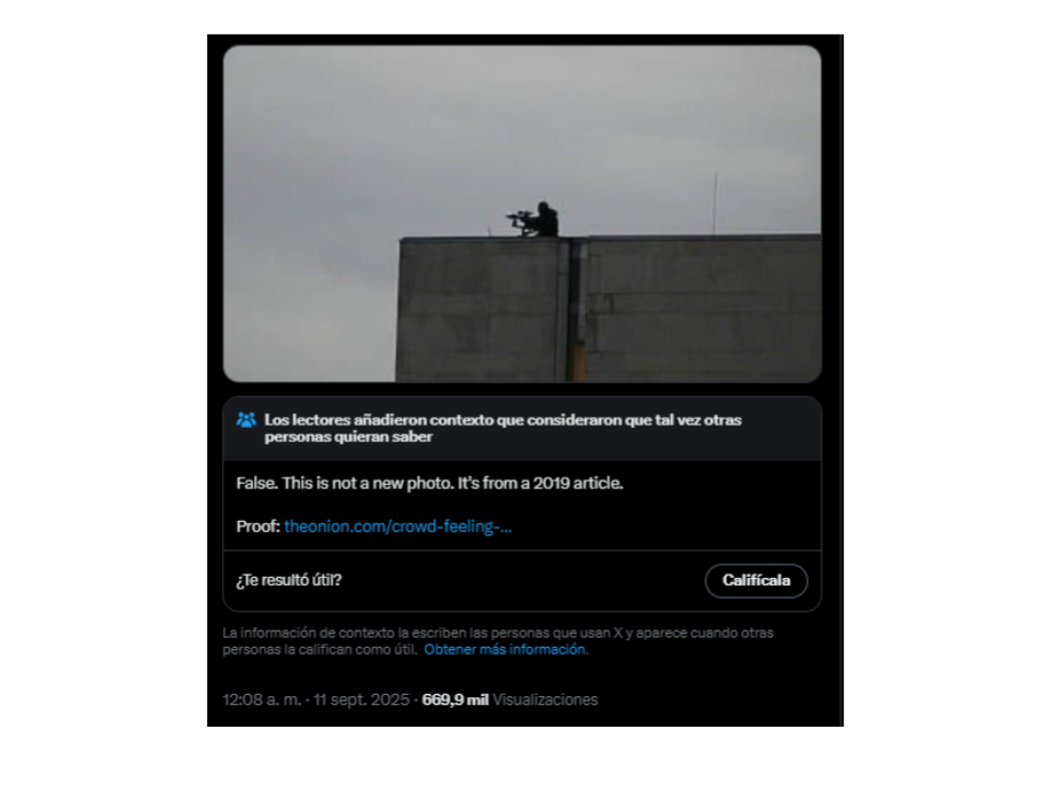 Otra afirmación falsa y viralizada usa la foto de un hombre apuntando con un arma larga, en la esquina del techo de un edificio. Dicen que es quien disparó a Charlie Kirk, pero no es así.