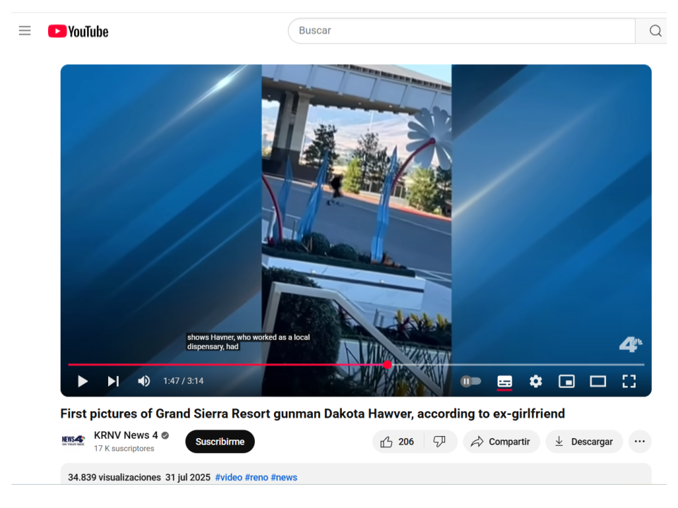 Una búsqueda inversa de imágenes en Google Lens a partir de una captura de pantalla del video nos llevó, entre varios resultados, a un video de YouTube de KRNV News 4, la filial en Reno, Nevada, de NBC. El video muestra la grabación aficionada como parte de las informaciones de un tiroteo masivo en un casino en Reno, a finales de julio de 2025. Al menos, más de un mes antes del asesinato de Kirk.