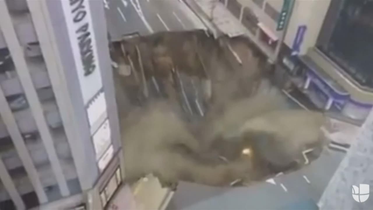 Un enorme cráter provoca el desmoronamiento de una carretera en la ciudad de Fukuoka al sudoeste de Japón el martes.