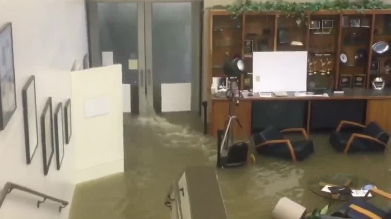 Los reporteros de la estación local filmaron el momento en que el edificio se llenó de agua. Unas 2,000 personas han pedido rescate en Houston debido a las inundaciones provocadas por Harvey.