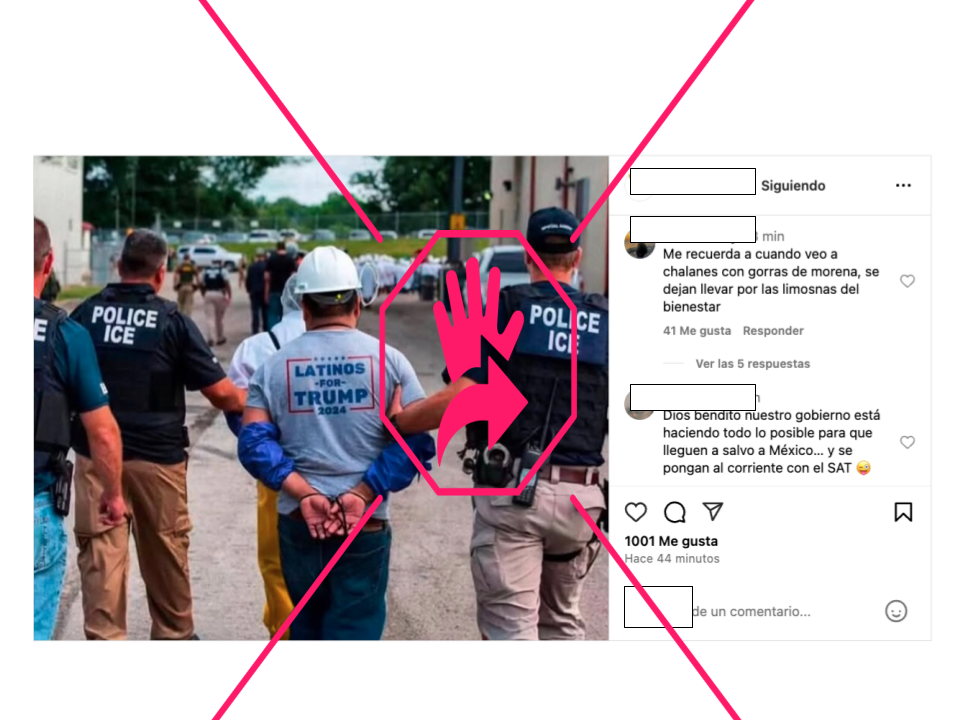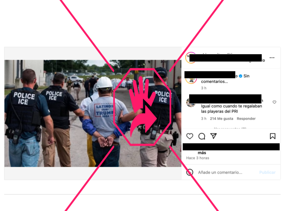 “Sin comentarios”, dice un mensaje que acompaña la fotografía en la que se ve a tres hombres portando chalecos con la frase “Police ICE”. Uno de ellos sostiene del brazo a un hombre esposado que porta un casco blanco, unas mangas azules que cubren sus antebrazos y una camiseta gris con la frase “Latinos for Trump 2024” en la espalda. Otro policía aparece tomando del brazo a otro individuo esposado que viste un pantalón amarillo y una camiseta blanca.