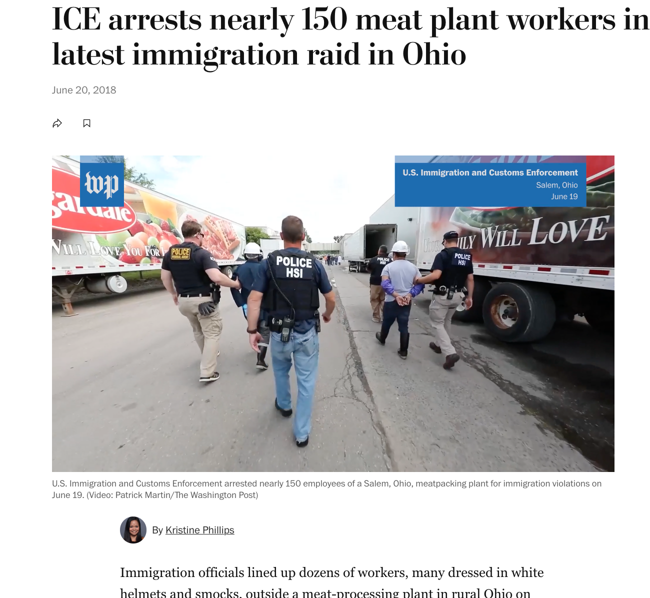 La historia informa que agentes especiales de ICE arrestaron a 146 personas que trabajaban en Fresh Mark, una compañía privada y proveedora de productos de carne y “alguna vez considerado por el gobierno como un socio en la prevención de la contratación de trabajadores indocumentados”. En el texto se cita a Steve Francis, agente especial de HSI que declaró en su momento: “El empleo ilegal es uno de los principales imanes que atraen a los inmigrantes ilegales a través de nuestras fronteras”.
