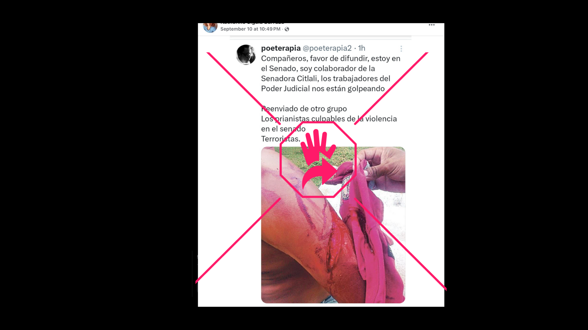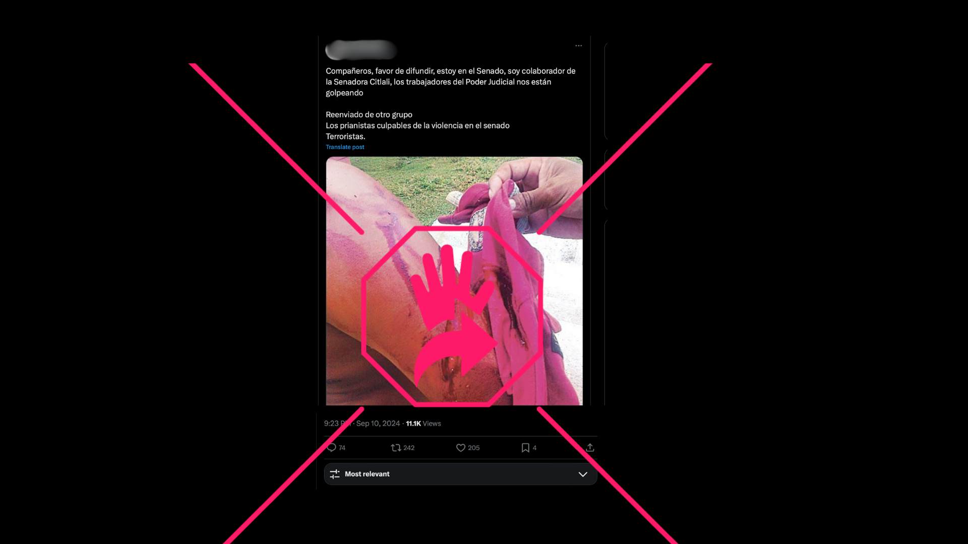 “Los prianistas [son] responsables de la violencia en el Senado. Terroristas”, afirma un post acompañado de la imagen de un brazo ensangrentado. Publicado el 10 de septiembre de 2024, pide: “Compañeros, favor de difundir, estoy en el Senado, soy colaborador de la senadora Citlalli [sic]. Los trabajadores del Poder Judicial nos están golpeando”. Esa misma publicación fue compartida en Facebook.