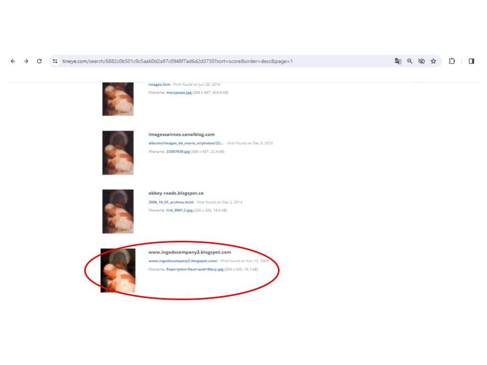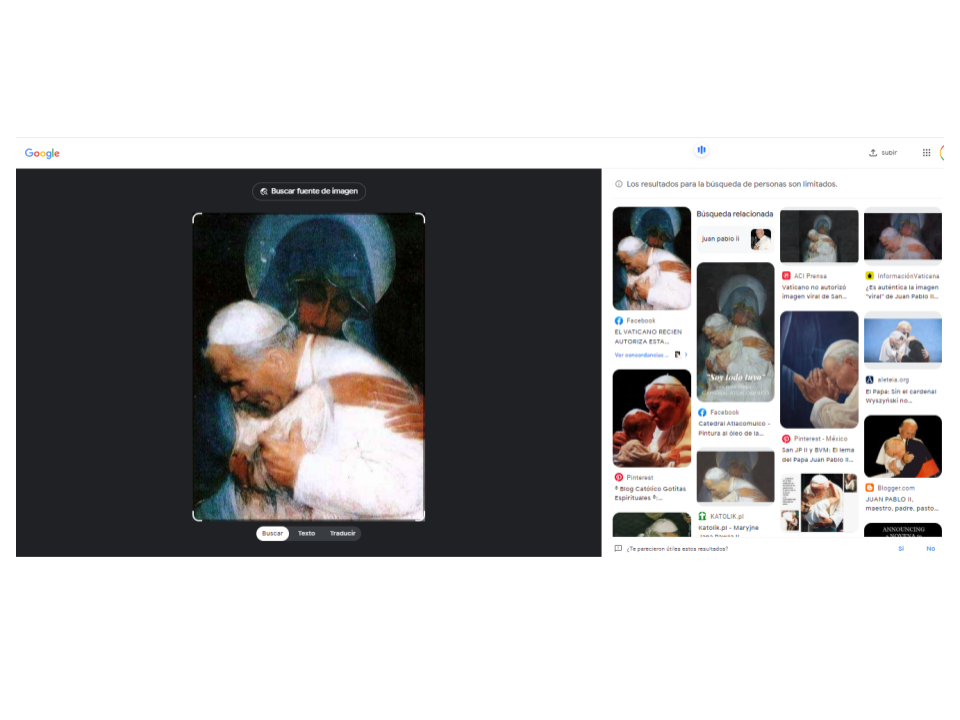 Con una búsqueda inversa de imágenes en TinEye encontramos que la imagen circula, al menos, desde 2009 en internet. Con otra búsqueda, esta vez en Google Lens, hallamos publicaciones que desmienten que se trate de una supuesta foto “recién autorizada por El Vaticano”.
