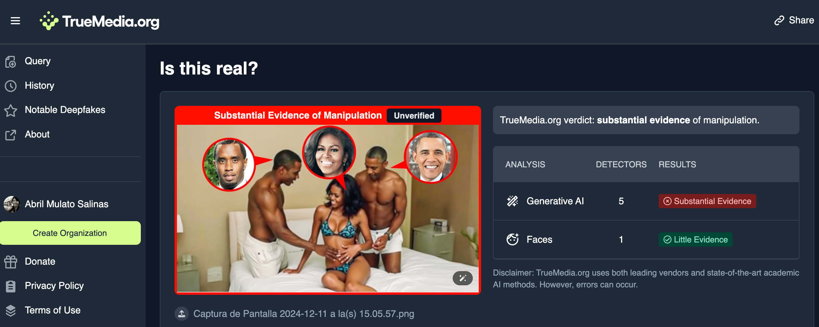 Posteriormente, analizamos la imagen con herramientas de detección de IA para verificar su autenticidad. La herramienta gratuita TrueMedia determinó que en la fotografía había una “evidencia sustancial de manipulación”.