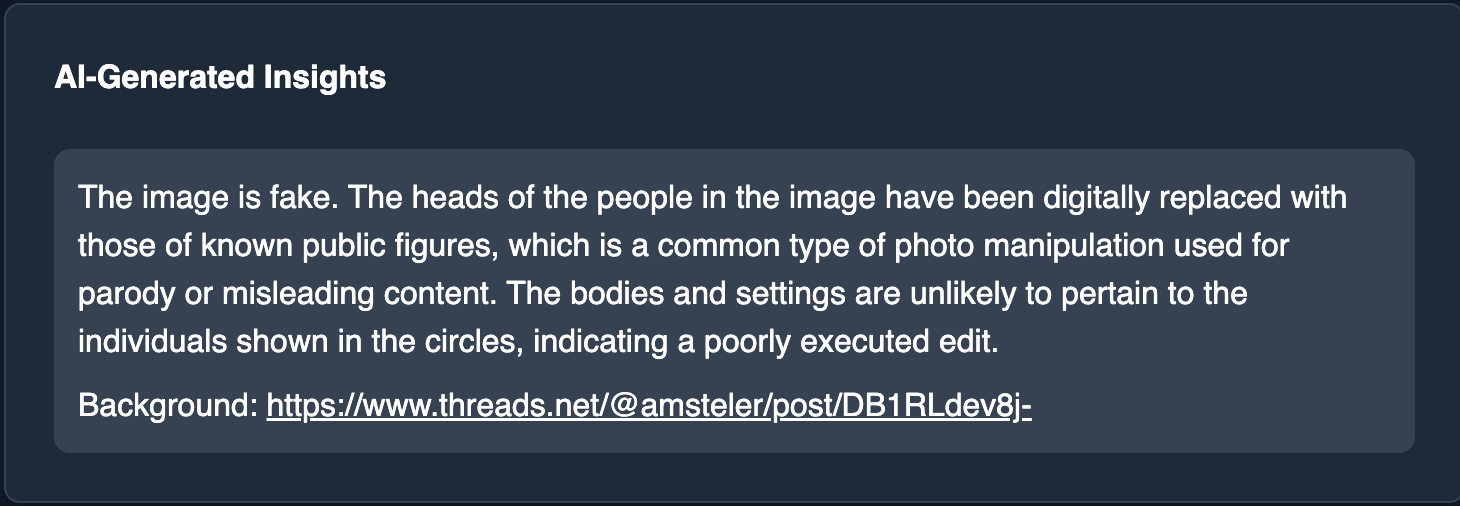El análisis de la herramienta dice que: “La imagen es falsa. Las cabezas de las personas que aparecen en la imagen han sido reemplazadas digitalmente por las de personajes públicos conocidos, lo que es un tipo común de manipulación fotográfica que se utiliza para parodias o contenido engañoso. Es poco probable que los cuerpos y los escenarios correspondan a las personas que aparecen en los círculos, lo que indica una edición mal ejecutada”.