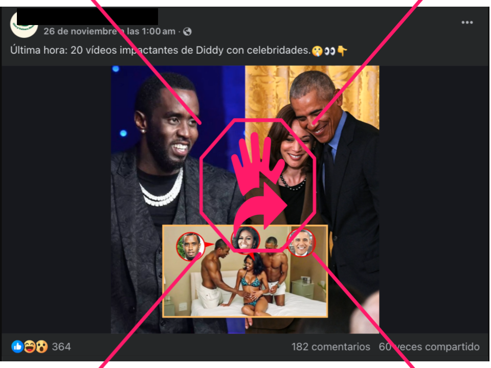 En Facebook circula una publicación con tres fotografías: la primera muestra al rapero Sean 'Diddy' Combs; la segunda a la vicepresidenta Kamala Harris junto al expresidente Barack Obama sonriendo; y la tercera, supuestamente, presenta a Combs, Obama y su esposa Michelle Obama en una habitación, semidesnudos en una cama. Pero es falso que esta última imagen sea parte de uno de los videos de Diddy con celebridades, como asegura el mensaje que acompaña al post, pues la misma fue generada con inteligencia artificial (IA). Tampoco existen reportes oficiales o mediáticos que la respalden como auténtica.