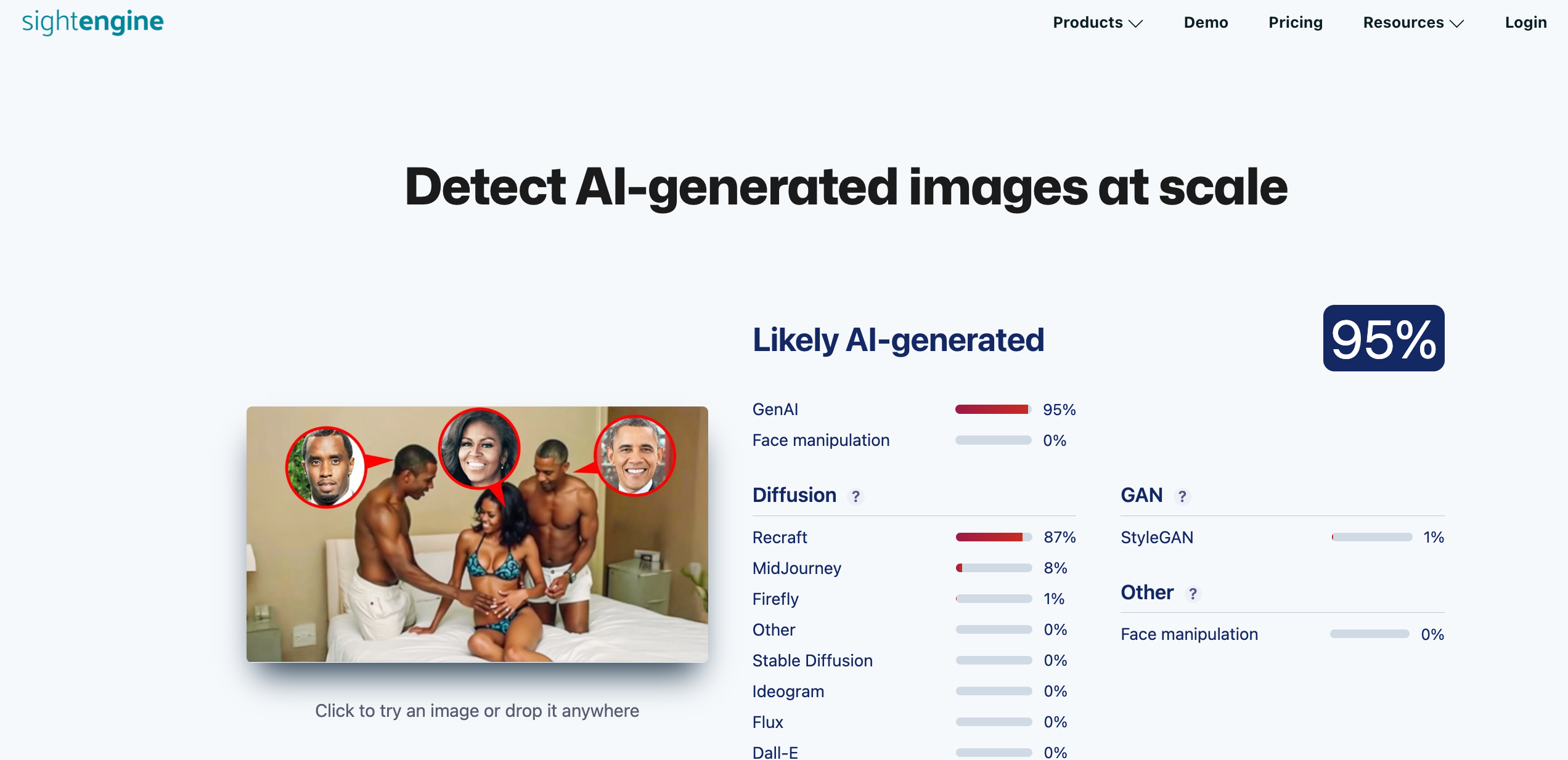 También Sightengine, otra herramienta gratuita, determinó con un 95% de probabilidad que la imagen fue intervenida mediante IA.