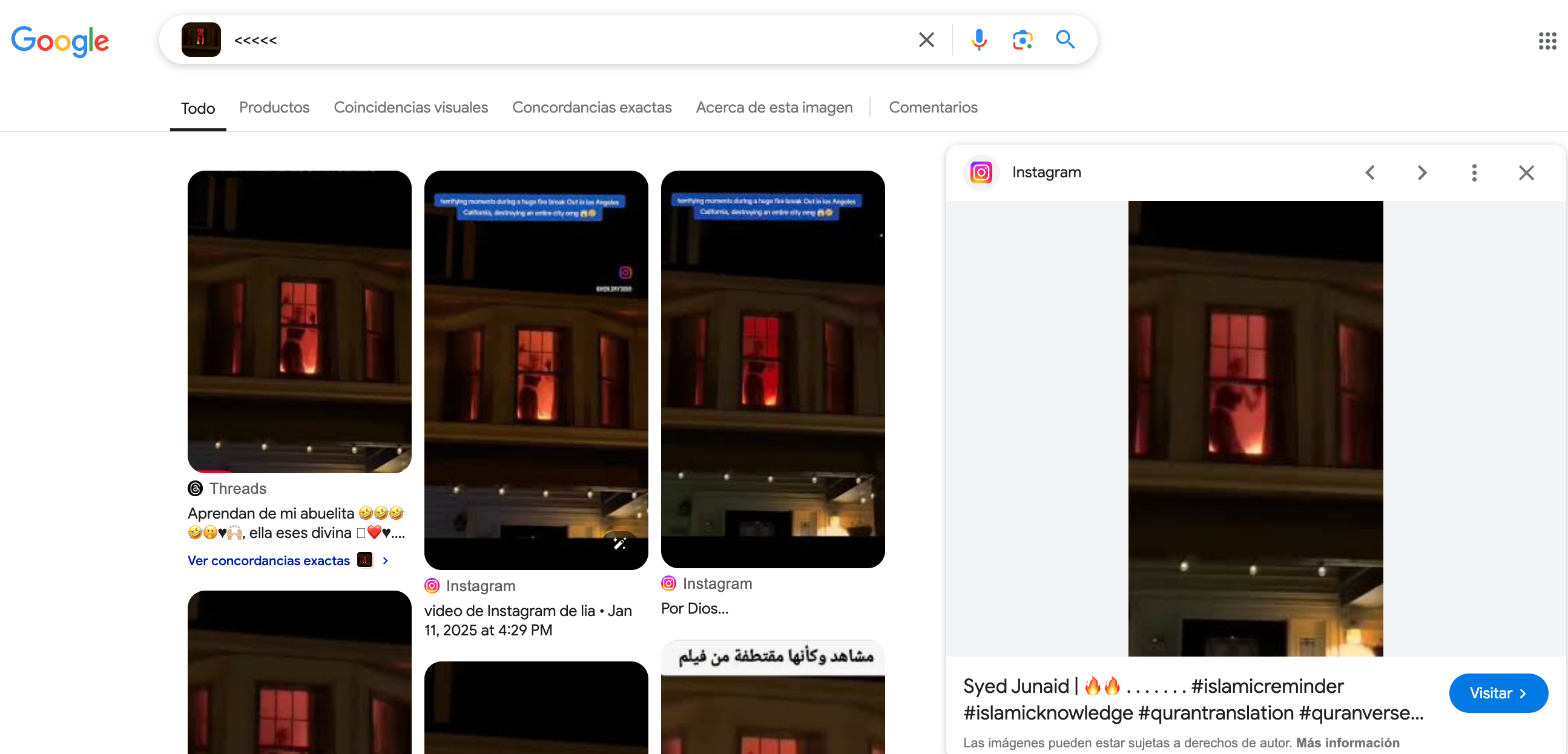 Desde elDetector realizamos una búsqueda inversa de imágenes en Google Lens y esta arrojó como resultado varios videos en redes en los que aparece un clip con la misma imagen de la supuesta mujer de la fotografía que estamos revisando. En la grabación, esta persona se asoma por la ventana de una casa en llamas, grita y la golpea.