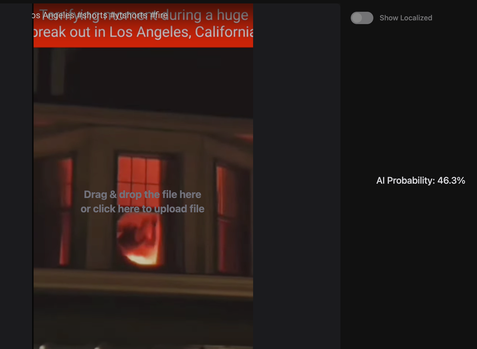 Debido a que, además del video de la mujer en la casa ardiendo, las secuencias que conforman el video muestran acabados poco definidos de las calles, los edificios, las personas y las estructuras, decidimos analizar la imagen con herramientas de detección de IA para verificar su autenticidad.