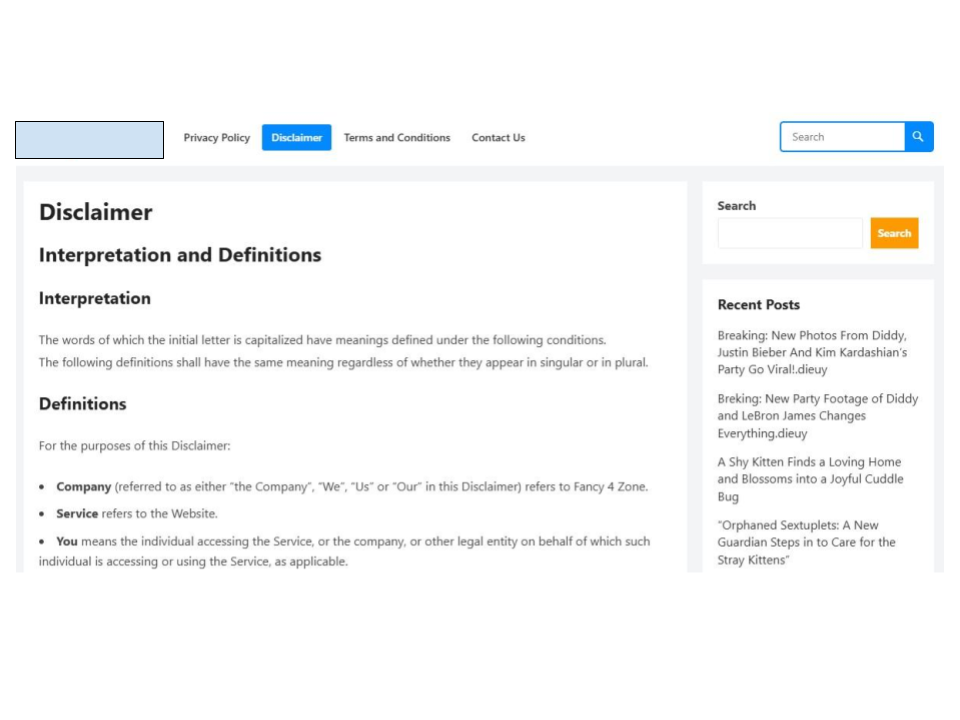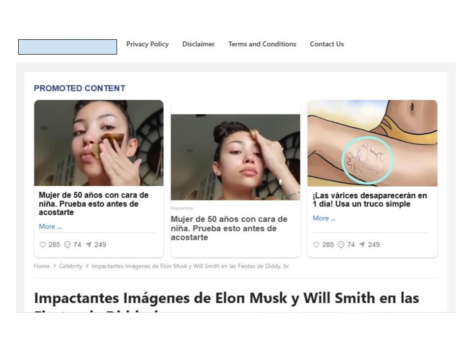 La página web tiene contenido patrocinado que rodea la supuesta noticia de Diddy, Smith y Musk, y además tiene un descargo de responsabilidad sobre el contenido y las promociones que allí se encuentran. No hay un directorio, ni un “acerca de”, que generalmente identifica a páginas auténticas de información.