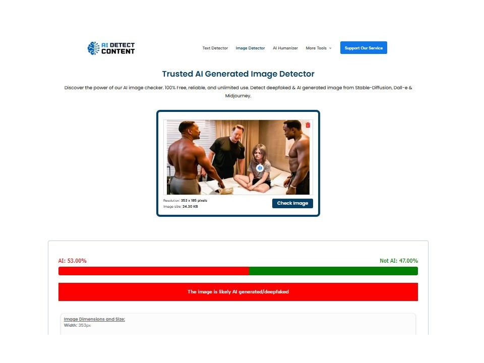 Otra herramienta gratuita, AI Content Detector, confirmó la intervención por IA en 53%. El análisis da que la imagen es generada por IA o es deepfake.