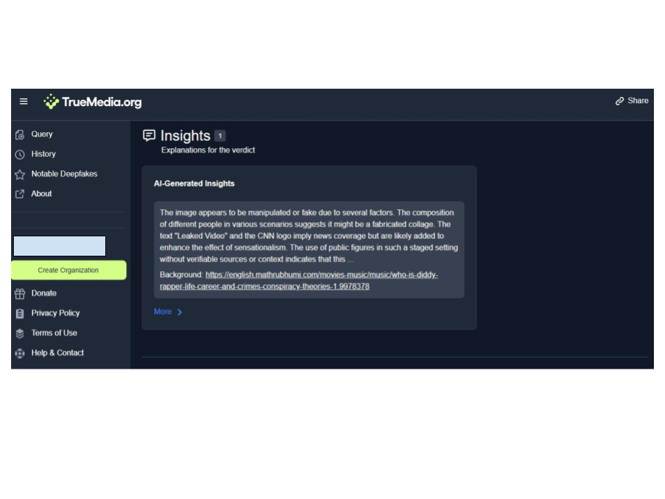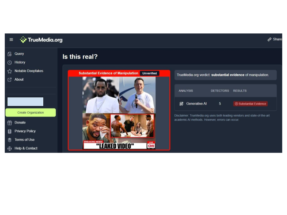 Con TrueMedia, una herramienta gratuita de detección de IA, escaneamos la supuesta fotografía y el resultado fue: evidencia sustancial de manipulación.