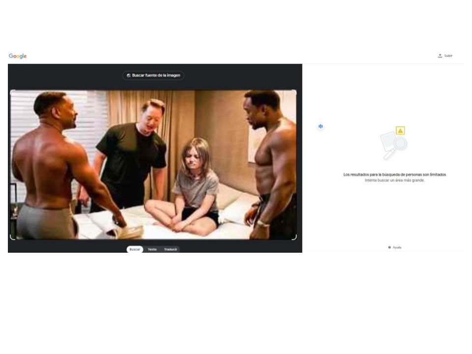 De la imagen notamos que los tres hombres que aparecen no se parecen a Diddy, Smith y Musk, salvo en que son dos hombres de color, como Smith y Diddy; y uno blanco con cabello castaño, como el dueño de X; la supuesta niña está superpuesta encima de la cama con las piernas cruzadas y sus rasgos se ven computarizados. Además, no están en una fiesta, como afirma la publicación en Facebook.