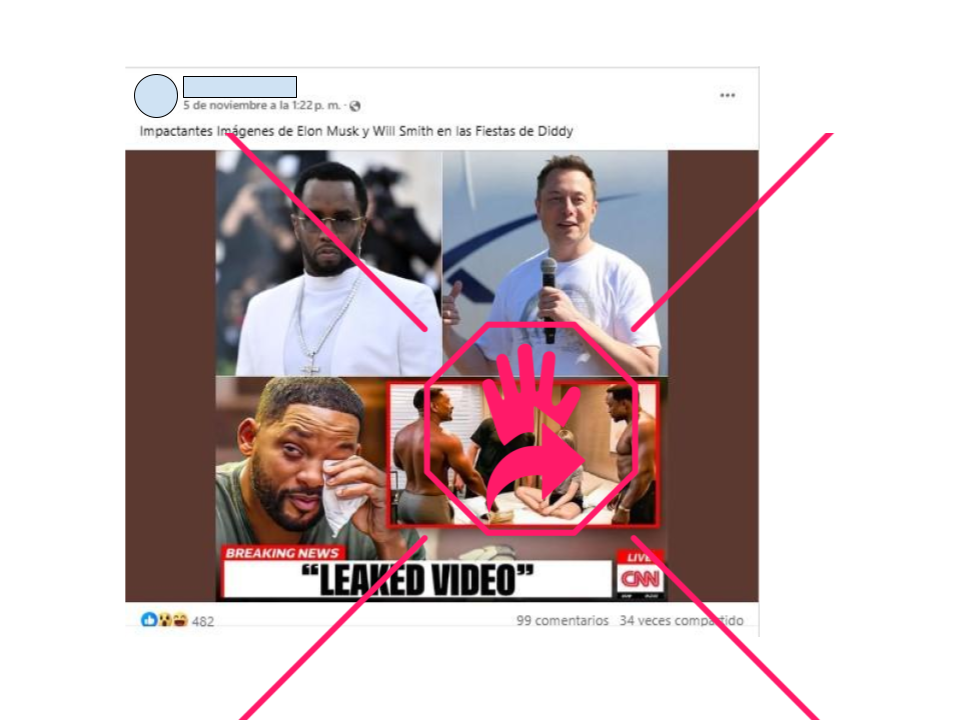 Es falsa la fotografía que supuestamente muestra al rapero Sean 'Diddy' Combs, al actor Will Smith y al empresario Elon Musk “en una fiesta de Diddy”. La imagen presenta a los tres hombres por separado y en una cuarta foto a dos hombres de color y uno blanco de cabello castaño, semejante a Musk, en una habitación con una menor de edad. La publicación mezcla varios elementos, típicos de desinformación: una supuesta fiesta que no se ve, los nombres de Smith, Diddy y Musk, detalles generales y nada de evidencias. Análisis de detección de inteligencia artificial arrojaron que la imagen es una creación digital. Además, la publicación en redes sociales dirige a una web de contenido patrocinado. Lee aquí cómo escogemos y asignamos nuestras etiquetas en elDetector.