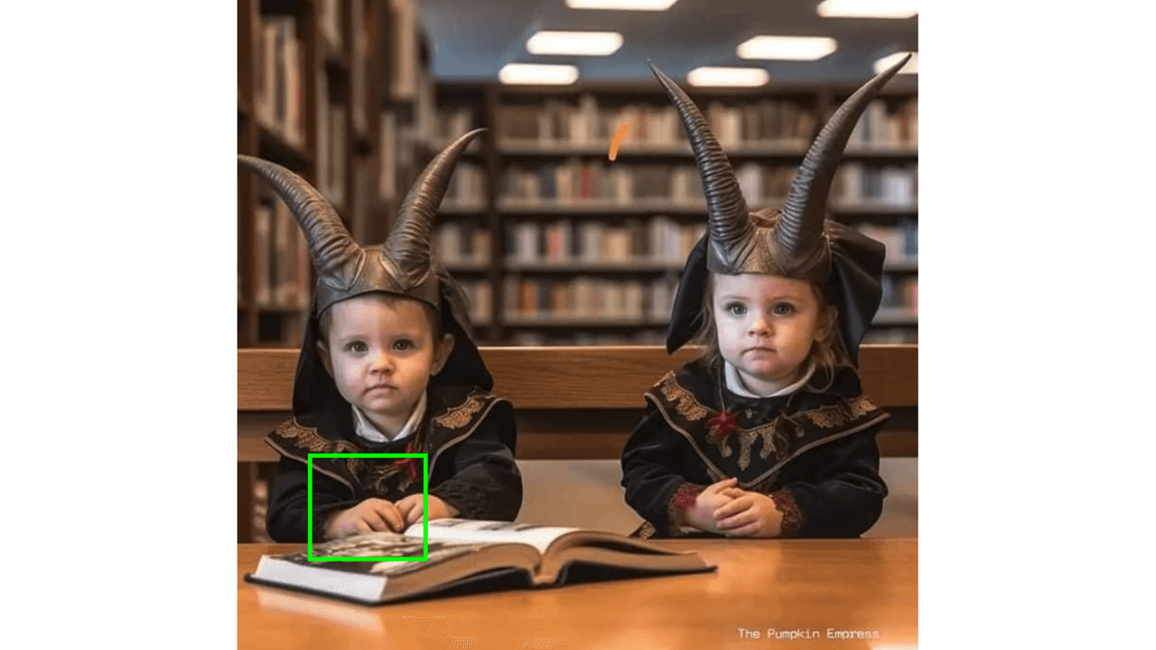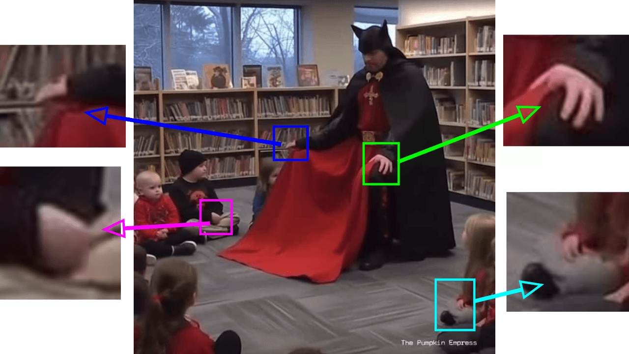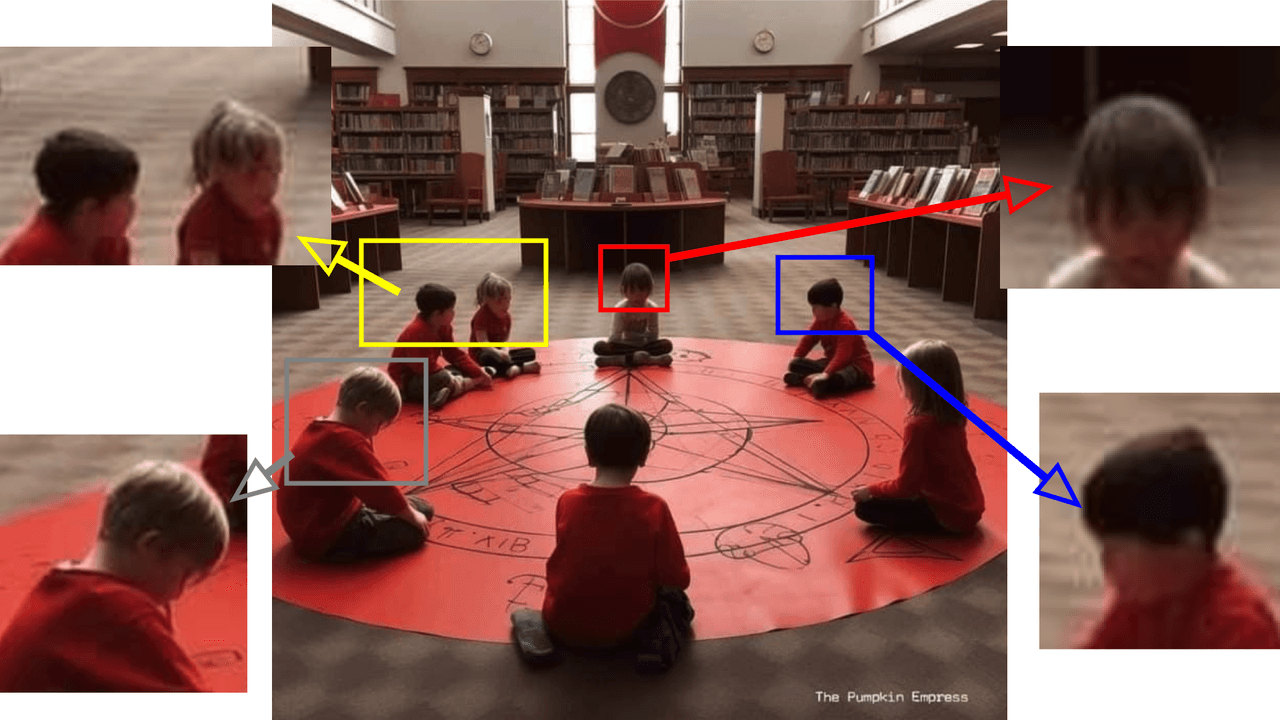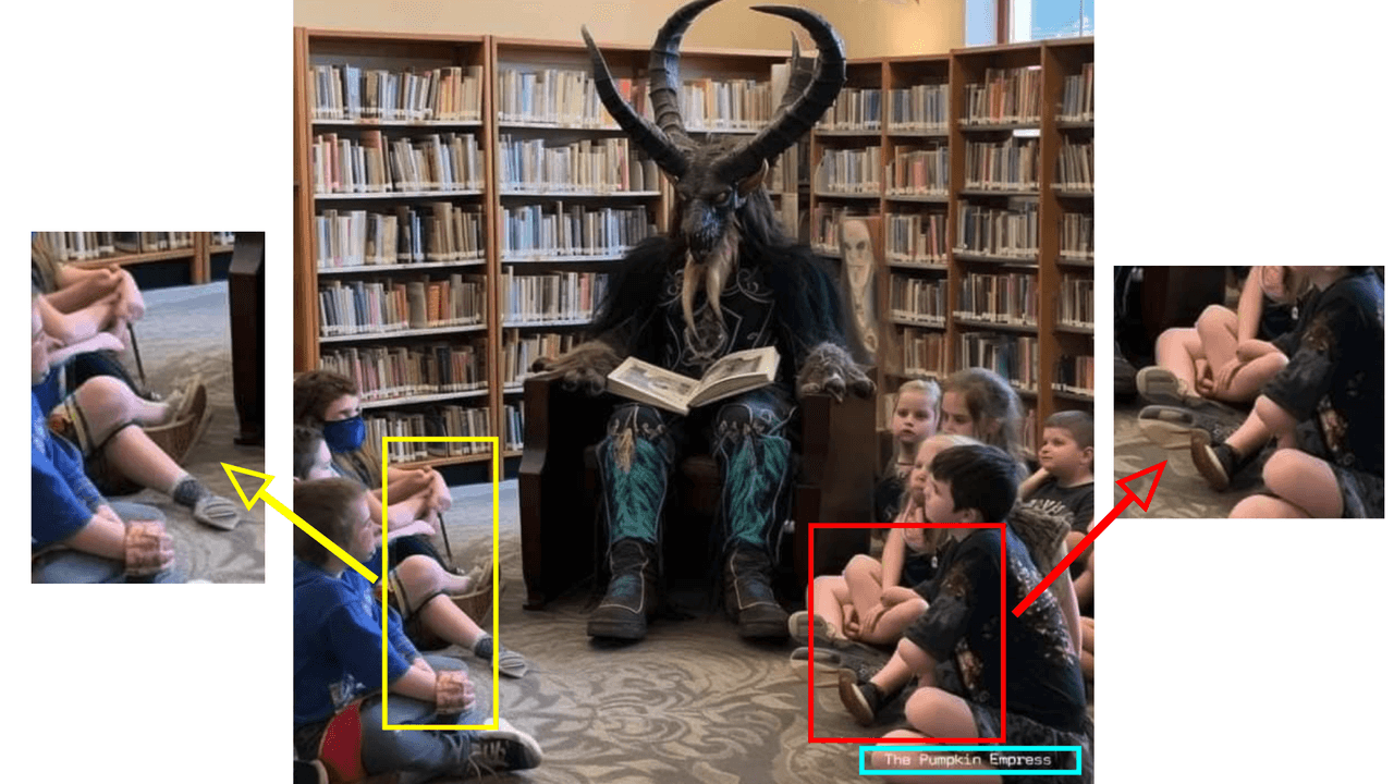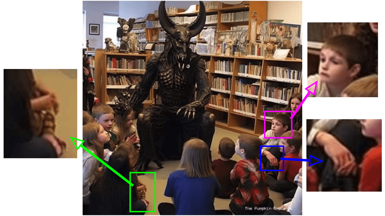 En la primera de las imágenes vemos a un supuesto demonio que parece estar leyendo un libro a un grupo de niños. Como se observa en los recuadros rojo y amarillo, las manos, piernas y pies de estos están superpuestos o entrelazados de forma antinatural. Al pasar la imagen por Optic AI or Not, dio un 75% de posibilidades de que la imagen sea creada con IA.