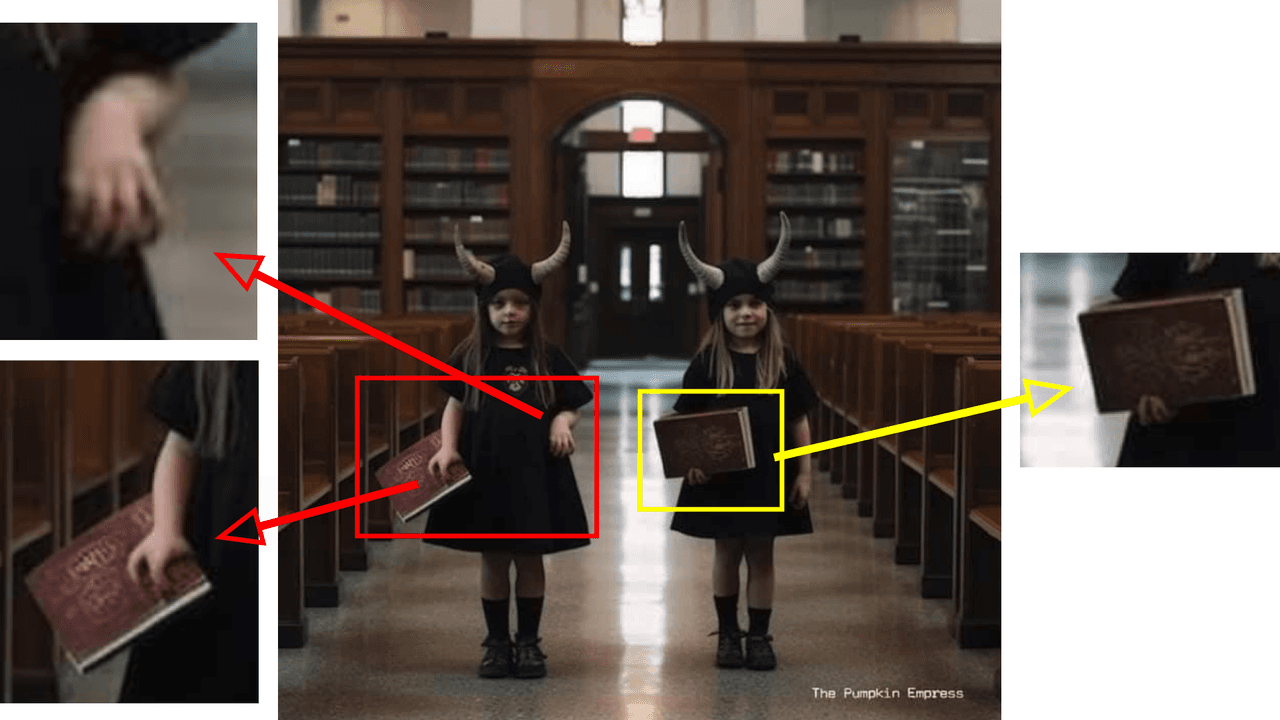 Por último, una supuesta pareja de niñas cuyas extrañas manos, sobre todo las de la pequeña que está a la izquierda de la imagen, delatan que no se trata de una foto real. Vemos que su mano derecha (recuadro rojo) apenas tiene tres dedos que sujetan, de manera antinatural, lo que parece ser un libro. Su otra mano, la izquierda, parece estar puesta al revés, ya que se ve el dedo meñique más largo que el anular y este más largo que el corazón o medio. En la niña de la derecha no se aprecian bien los dedos de su mano derecha, la que sujeta, como su compañera, un libro, pero no parece que tenga cinco dedos. Optic AI or Not calcula en un 93% las probabilidades de que esta supuesta foto sea una creación de un programa de IA.