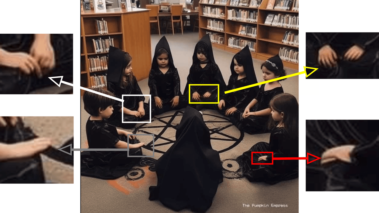 En la tercera de las imágenes observamos un grupo de niñas en círculo todas vestidas de negro. Las manos revelan la falsedad de la imagen: faltan dedos (recuadros gris y blanco), o los tienen demasiado finos y puntiagudos (recuadro amarillo) o, incluso, no se puede decir que sean manos (recuadro rojo). De acuerdo con Optic IA or Not, tiene un 90% de probabilidad de ser creada con IA.