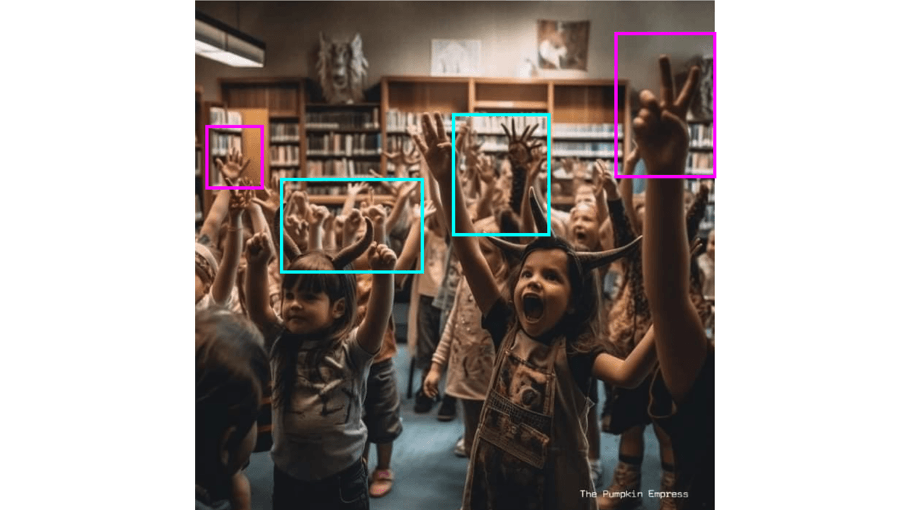 Entre las que más claramente se puede ver que no es real es la del grupo de niños con brazos levantados. Manos con seis y cuatro dedos (recuadros violetas) y un cúmulo de brazos que no sabemos a quién pertenecen (recuadros azul claro). Al pasarla por Optic IA or Not, calcula que existe un 81% de posibilidad de que sea creada por inteligencia artificial.