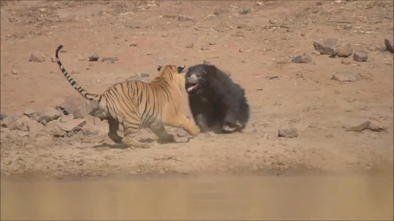 El Parque Nacional Tadoba, en India, donde habitan y reinan varias decenas de tigres, se prendió una batalla campal cuando una osa y su cachorro trataban de beber agua en un lago que está vigilado por el tigre Matkasur.