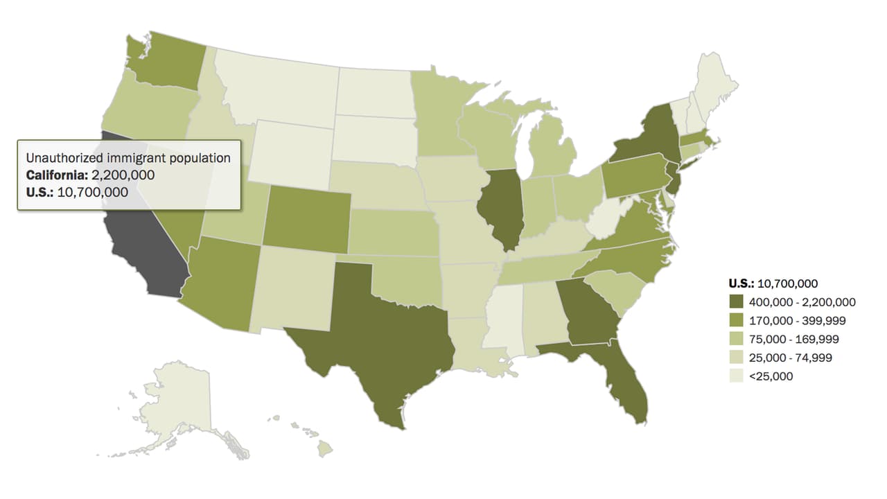 Los inmigrantes indocumentados representan cerca del 25% de la población extranjera en Estados Unidos, pero no son la mayoría de inmigrantes en ningún estado: donde son numerosos, alcanzan un tercio o más de la población. Esto ocurre en al menos 16 estados, como Alabama, Arkansas, Colorado, Georgia, Idaho, Kansas, Louisiana, Mississippi, Nebraska, Nevada, Carolina del Norte, Oklahoma, Carolina del Sur, Tennessee, Texas y Utah.