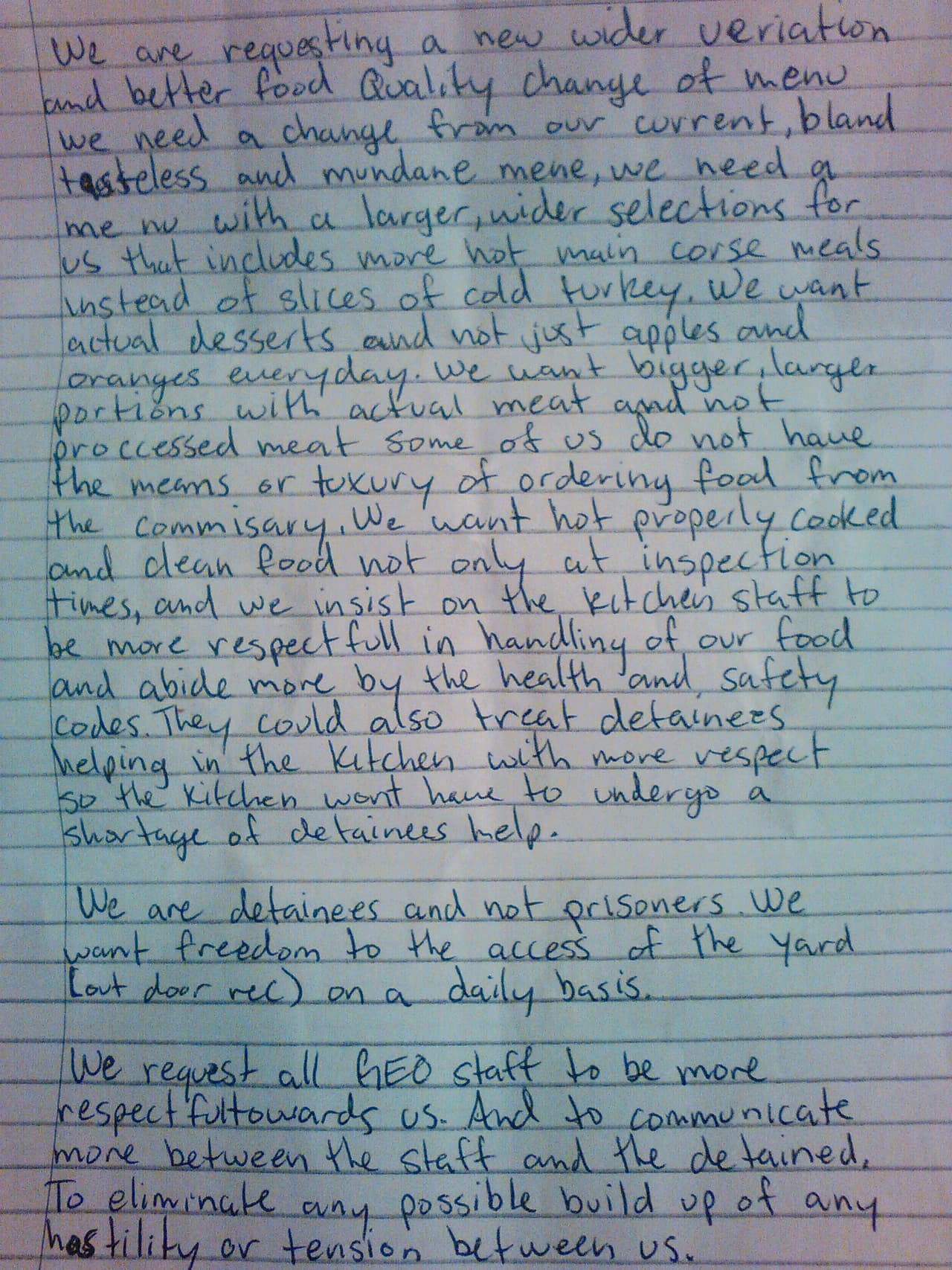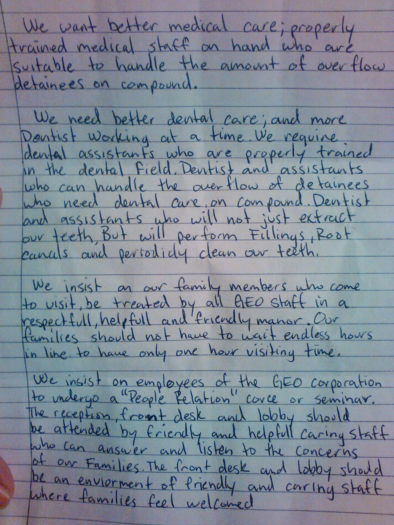 Las alegaciones de los internos fueron escritas en un documento de tres páginas que fue sacado del centro y distribuido por activistas. Los huelguistas alegan abusos en las instalaciones operadas por la empresa privada GEO.