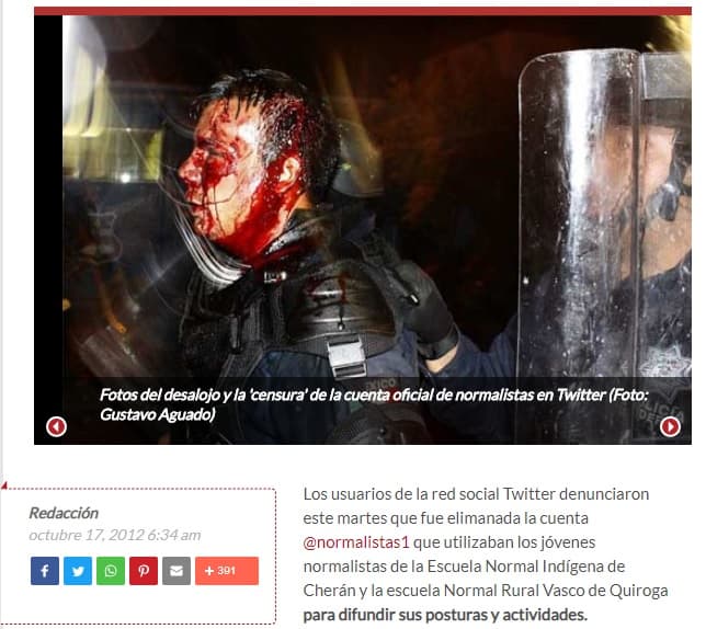 Gustavo Aguado Butanda, un fotoperiodista que radica en el occidental estado de Michoacán, dijo Univision Noticias que tomó la imagen el 15 de octubre de 2012. Ese día, según relata el reportero, la Policía Federal entró a la Escuela Normal del poblado de Tiripetío y hubo un enfrentamiento entre estudiantes y normalistas.