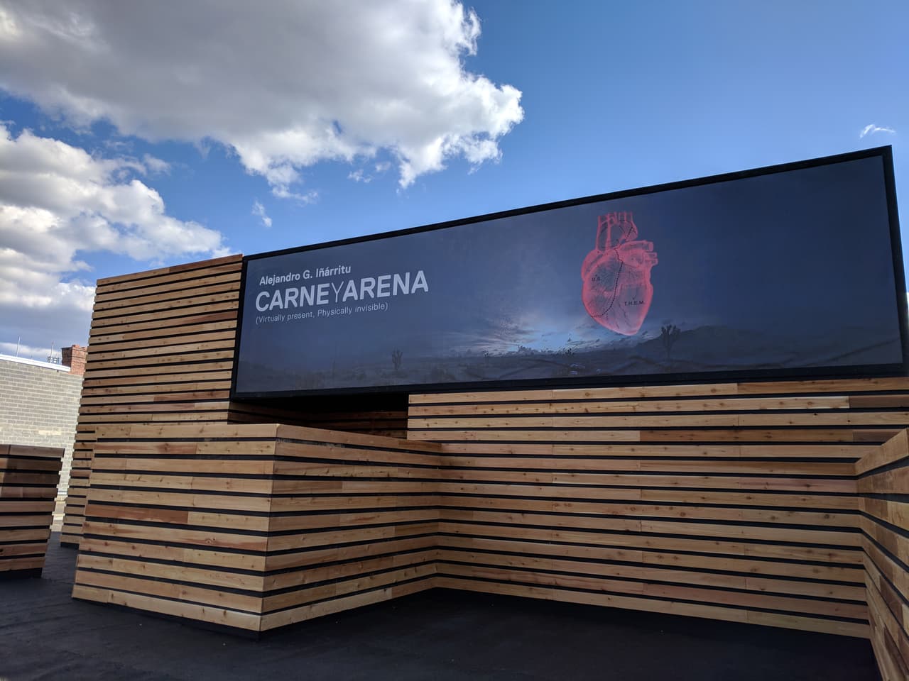Los residentes locales deambulan, curiosos, frente a este moderno edificio de madera, intentando traducir al inglés las palabras en español Carne y Arena plasmadas en la fachada del edificio. La carretera separa la instalación de un centro comercial decaído y al lado se ubica un McDonald’s. Visto desde afuera, el concepto ya intriga.