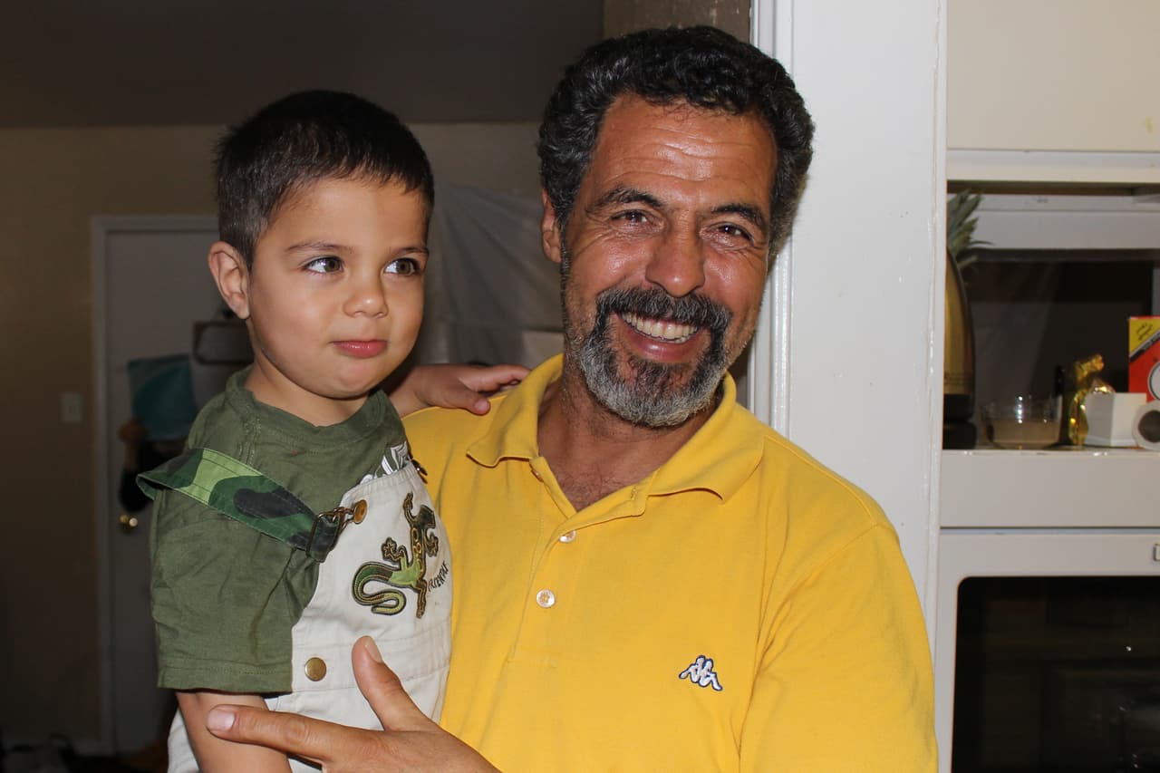 Khalaf, un hombre sirio de 55 años tiene la fortuna de abrazar a su pequeño de 2 años al tiempo que observa a sus otros cuatro hijos y a su esposa hacer los preparativos para la cena en su nuevo hogar en Houston, Texas.