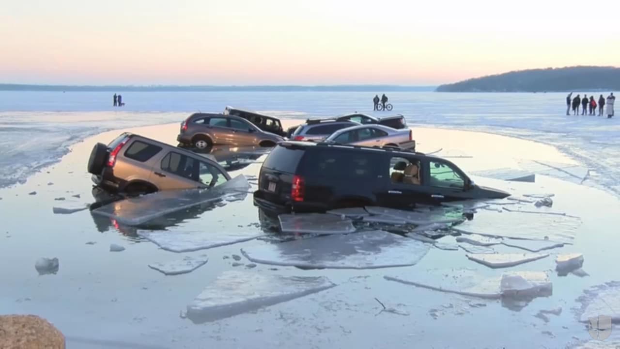 El Lago de Geneva en Wisconsin cedió ante el peso de unos 15 autos que fueron estacionados sobre el hielo.