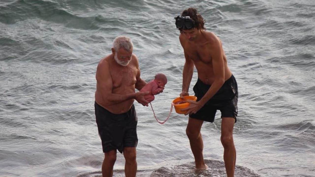 Una mujer que se encontraba frente a la playa, captó el nacimiento del bebé dentro del agua, y cómo el padre y un supuesto médico lo llevaban a tierra firme aún unido a la placenta. La madre emergió del agua en bañador cómo si llegara de tomarse un baño.