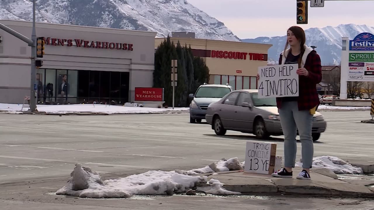 Jessica Gale y su pareja hace trece años que buscan un embarazo. Su sueño ha llevado a esta joven de Utah a tomar tres trabajos para ahorrar y cuando tiene un rato, hasta salir a pedir más aportes en una esquina para poder costear un tratamiento de fertilidad.