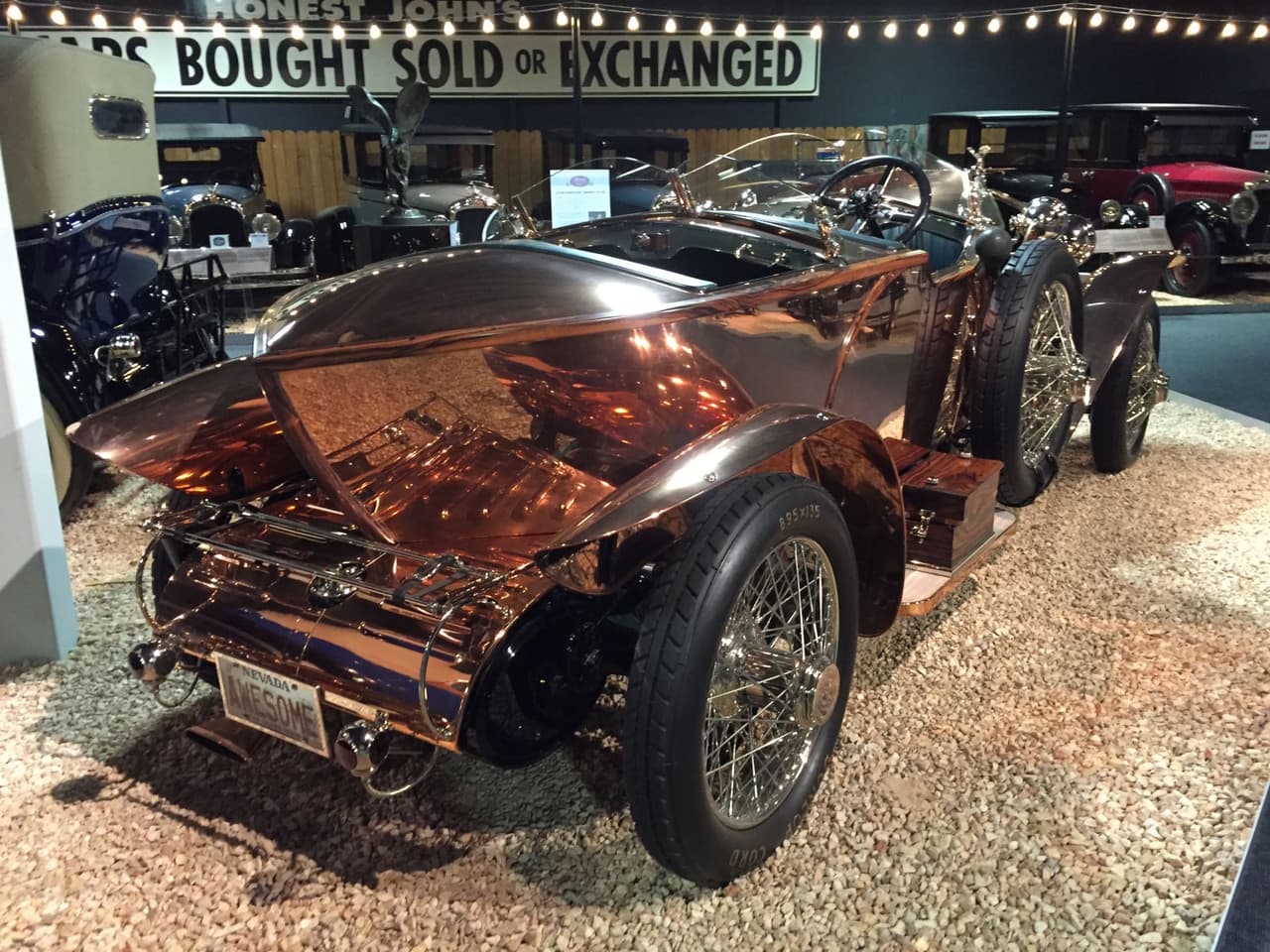 El Museo Nacional del Automóvil, a pesar de la palabra “nacional” en el título, no es una especie de museo oficial de autos de Estados Unidos. No es parte del Instituto Smithsonian, como el Museo Nacional del Aire y el Espacio, ni nada. En su mayoría, se basa en la colección de William F. Harrah, el fundador del imperio de los casinos Harrah, que murió en 1978. El coche más nuevo que pude encontrar fue una réplica de un Jaguar XJR-9 de 1988. El original más reciente que vi fue un DeLorean DMC-12 chapado en oro, creado para una promoción de American Express, y saludando a los visitantes en la parte delantera del museo.