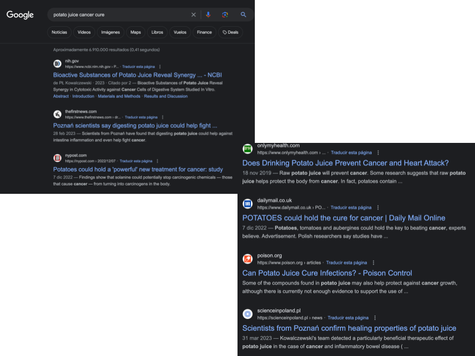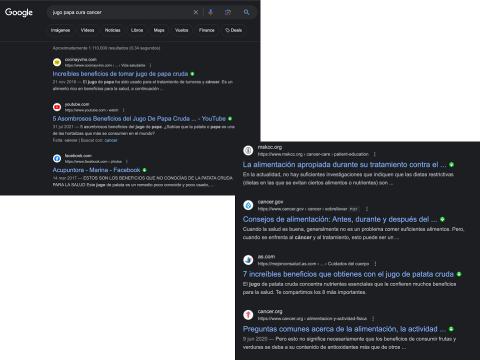 Google. Búsqueda con las palabras clave “jugo papa cura cáncer” en inglés y en español. 3 de agosto de 2023.