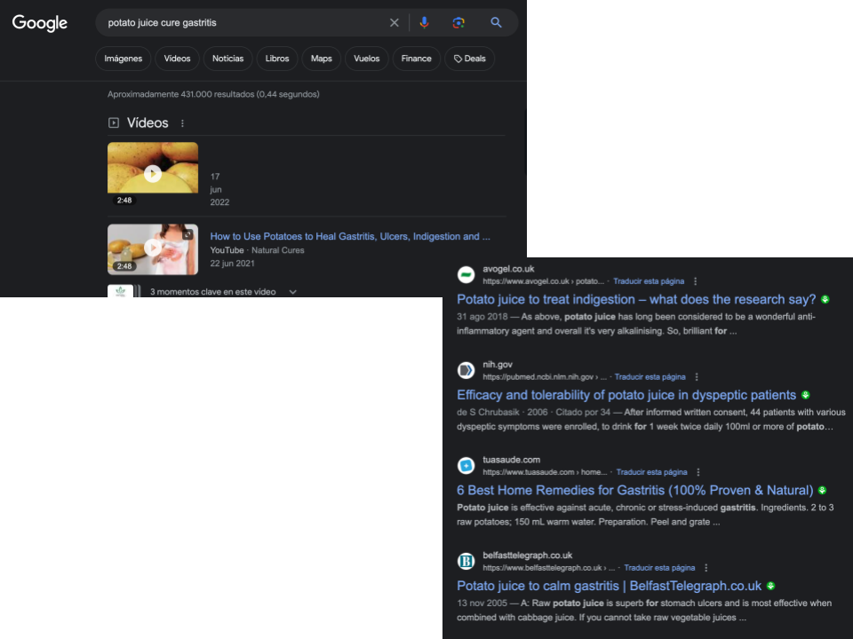 Google. Búsqueda con las palabras clave “jugo papa cura gastritis” en inglés y en español. 3 de agosto de 2023.