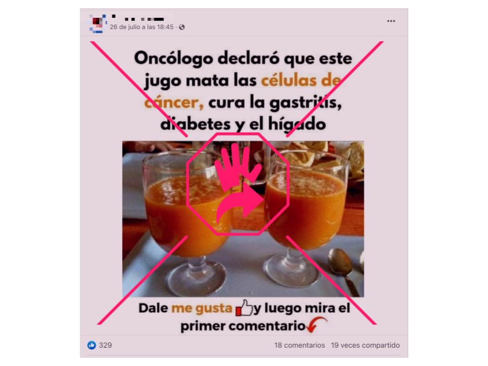 “Oncólogo declaró que este jugo mata las células de cáncer, cura la gastritis, diabetes y el hígado”, dice el texto del post en Facebook, ilustrado con una imagen en la que se ven dos copas con un líquido naranja. “Dale me gusta y luego mira el primer comentario”, añade.
