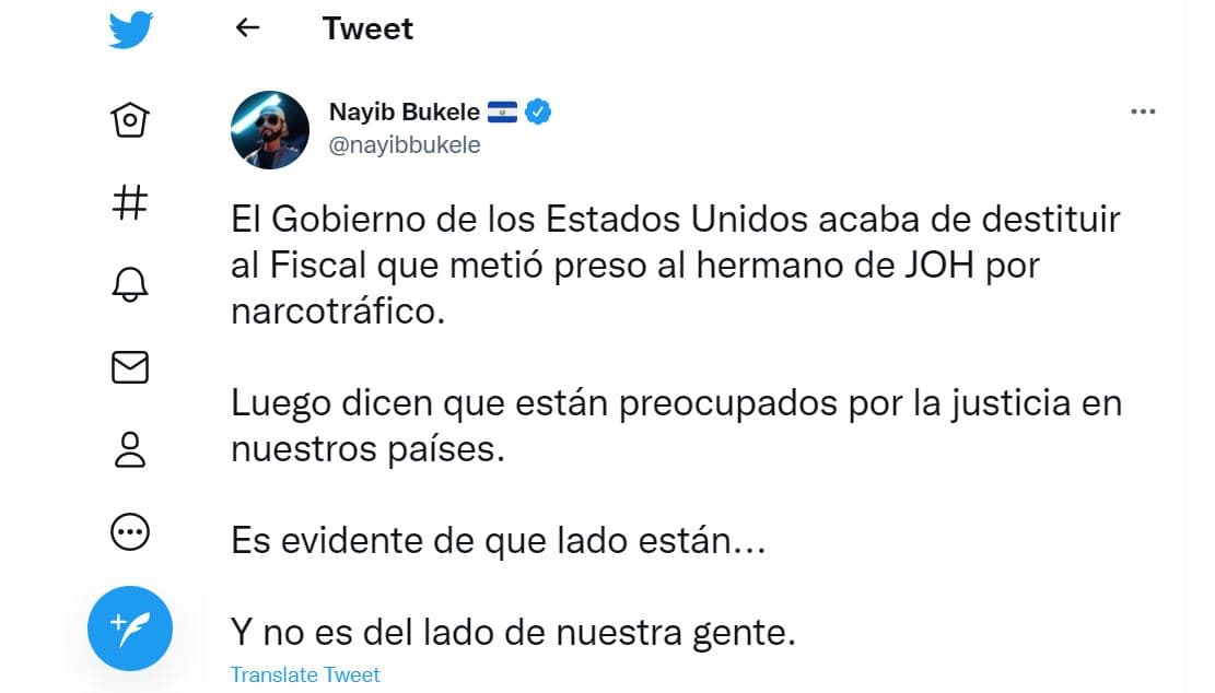 El presidente de El Salvador, Nayib Bukele, saltó con un tuit cuando la renuncia se hizo pública, diciendo: "El Gobierno de los Estados Unidos acaba de destituir al Fiscal que metió preso al hermano de [Juan Orlando Hernandez] por narcotráfico. Luego dicen que están preocupados por la justicia en nuestros países".
