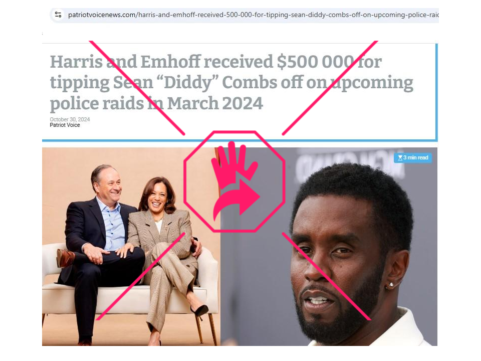 Es falso que la vicepresidenta y candidata demócrata, Kamala Harris, y su esposo Doug Emhoff, hayan recibido una pago de medio millón de dólares por parte del rapero Sean “Diddy” Combs, en marzo de 2024, para alertarle sobre redadas policiales. La afirmación circula en Facebook con una captura de pantalla de una página web, que atribuyen a Patriot Voice (Voz Patriótica), un sitio calificado como de baja credibilidad, de acuerdo con Media Bias / Fact Check, una plataforma que evalúa el sesgo de las fuentes de los medios.