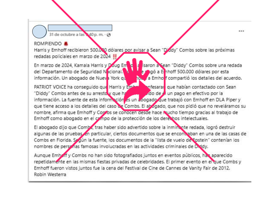 Es falso que la vicepresidenta y candidata demócrata, Kamala Harris, y su esposo Doug Emhoff, hayan recibido una pago de medio millón de dólares por parte del rapero Diddy para alertarle sobre redadas policiales, en marzo de 2024. La fuente sobre el supuesto hecho es Patriot Voice, una página web calificada en Media Bias / Fact Check, como cuestionable por “sesgo extremo, promoción constante de propaganda/conspiraciones”. Además, la Agencia Americana de Ciberdefensa (CISA), el FBI y la Oficina del Director de Inteligencia Nacional (ODNI) hicieron una declaración conjunta el 1 de noviembre de 2024, donde califican de falsedad la acusación. Lee aquí cómo escogemos y asignamos nuestras etiquetas en elDetector.