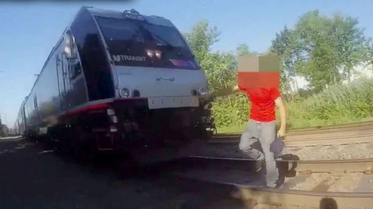 El oficial de policía de Perth Amboy en Nueva Jersey, Kyle Savoia, le gritó al sujeto para alertarlo mientras porque el tren se acercaba a toda velocidad. Milagrosamente, se detuvo antes de golpearlo. Luego de lo ocurrido, el sujeto cruzó la vía para agradecérselo.