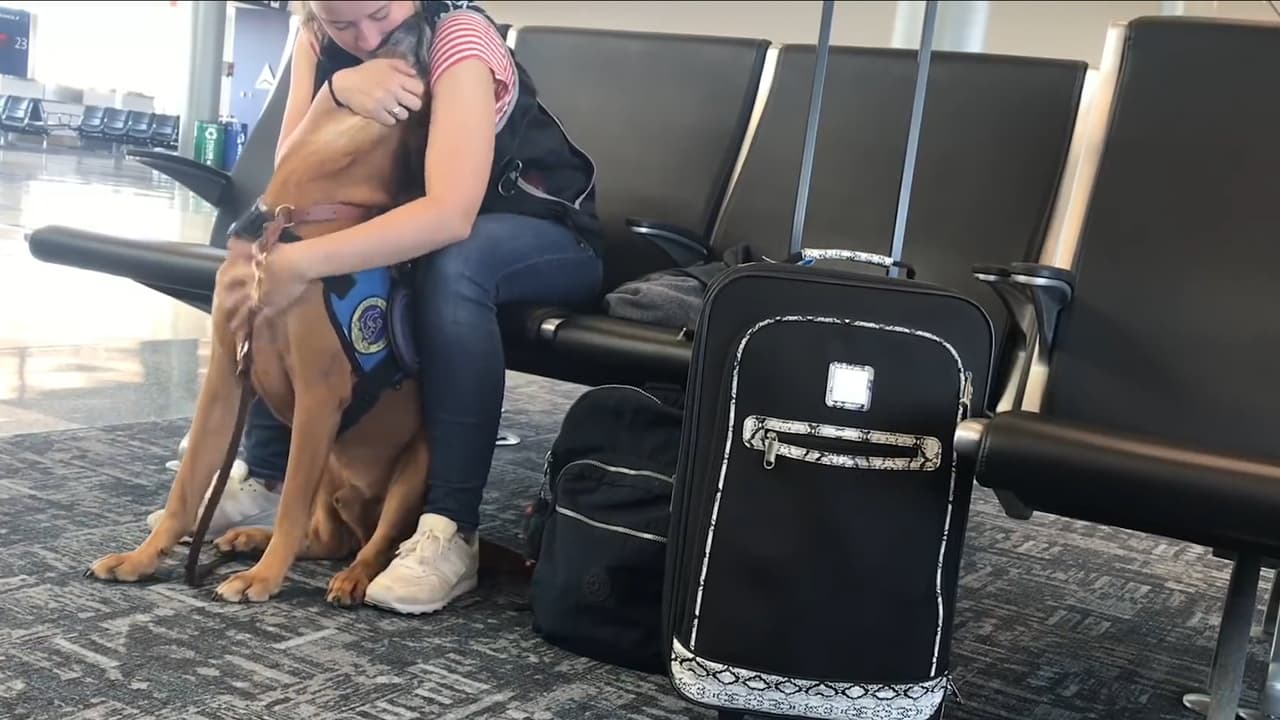 Amber estaba esperando un vuelo en el aeropuerto de Kentucky junto a su perro de apoyo emocional cuando comenzó a sentirse mal. El canino lo detectó y rápidamente fue en su ayuda.