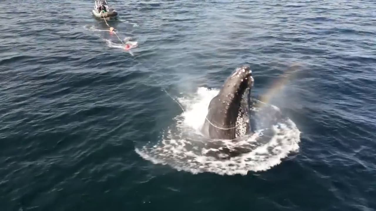 Un equipo de rescate de mamíferos marinos en Columbia Británica realizó trabajos durante varias horas para desenredar a una ballena jorobada que había quedado atrapada entre cientos de pies de cuerda y equipo de pesca. Más información en