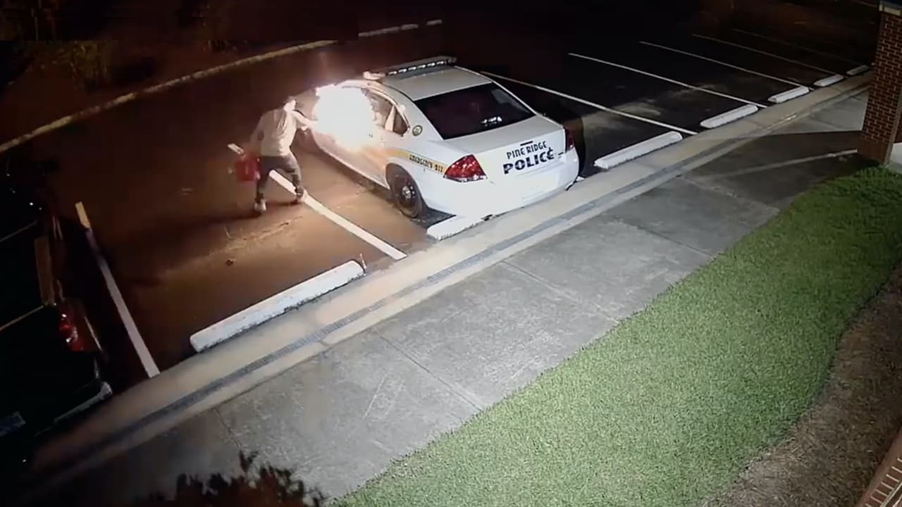 La Policía de Carolina del Sur busca a un individuo que fue grabado por una cámara de vigilancia incendiando un auto-patrulla en la estación de Pine Ridge, al suroeste de Columbia.