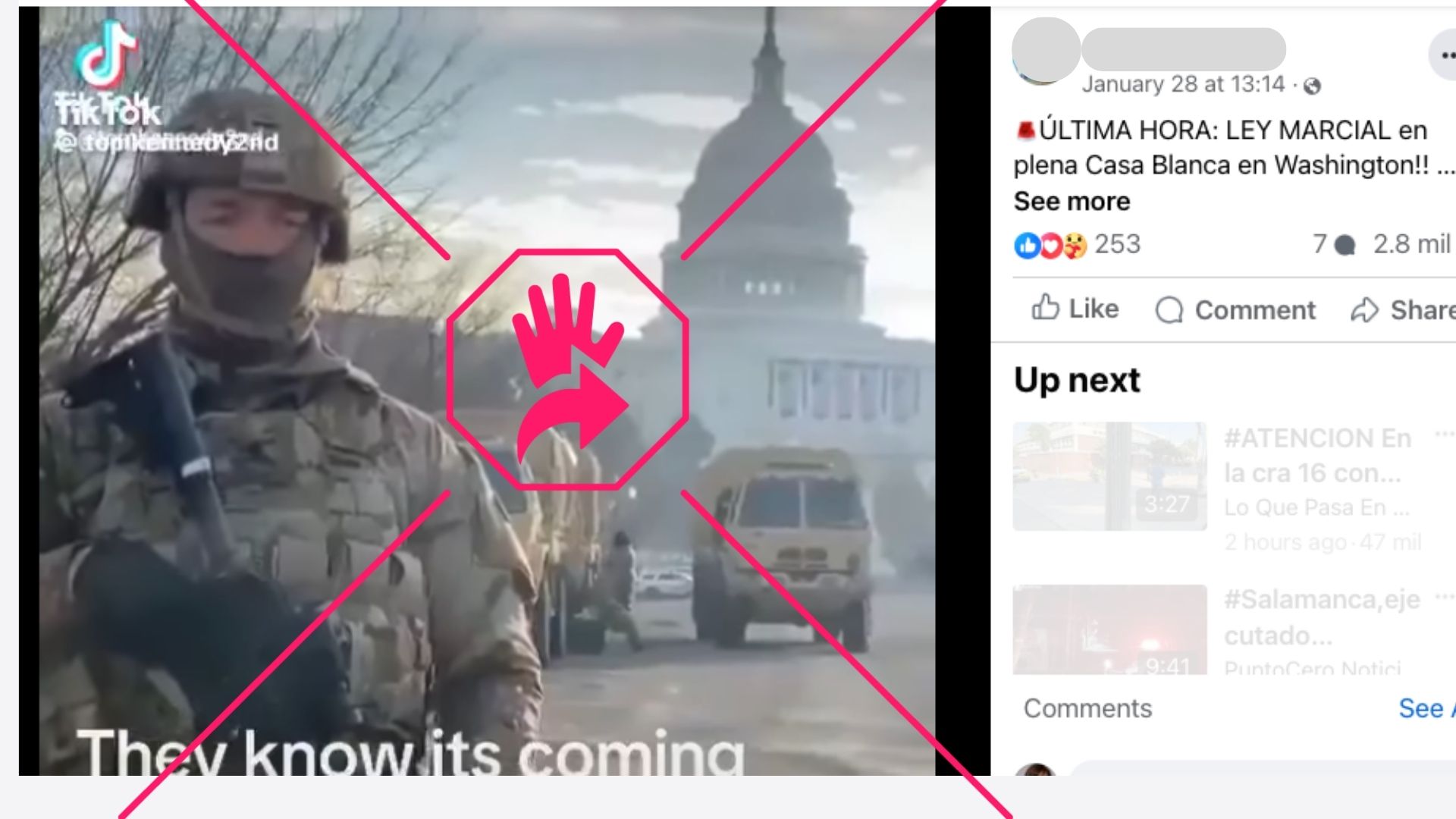 El texto en uno de los posts, publicado el 28 de enero de 2024, dice erróneamente: “Última hora: Ley marcial en plena Casa Blanca en Washington”. El video, con más de 2,800 visualizaciones, muestra al inicio a un soldado de pie sujetando un arma larga frente al Capitolio. Al fondo se aprecian dos vehículos militares color beige y la parte frontal de un automóvil. La cámara se desplaza hacia la derecha y vemos a más de una decena de soldados armados en la acera y con los rostros cubiertos con tapabocas.