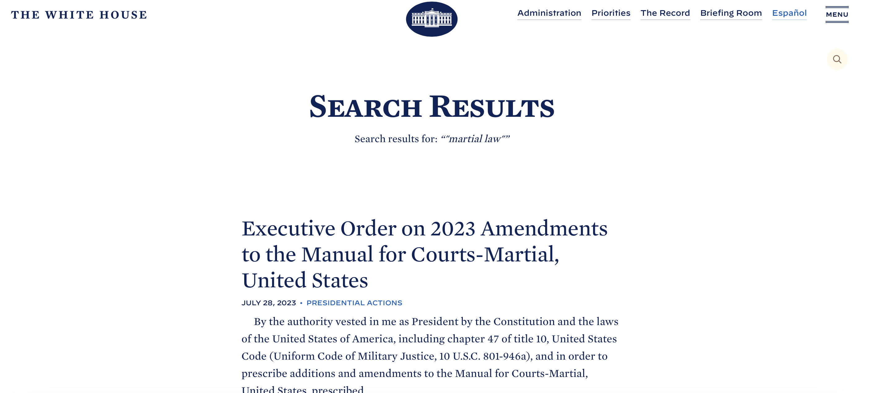 Sin embargo, elDetector no encontró ningún indicio en los comunicados del sitio web oficial de la Casa Blanca ni en registros periodísticos de que el gobierno federal haya anunciado la aplicación de la “ley marcial” en Estados Unidos.