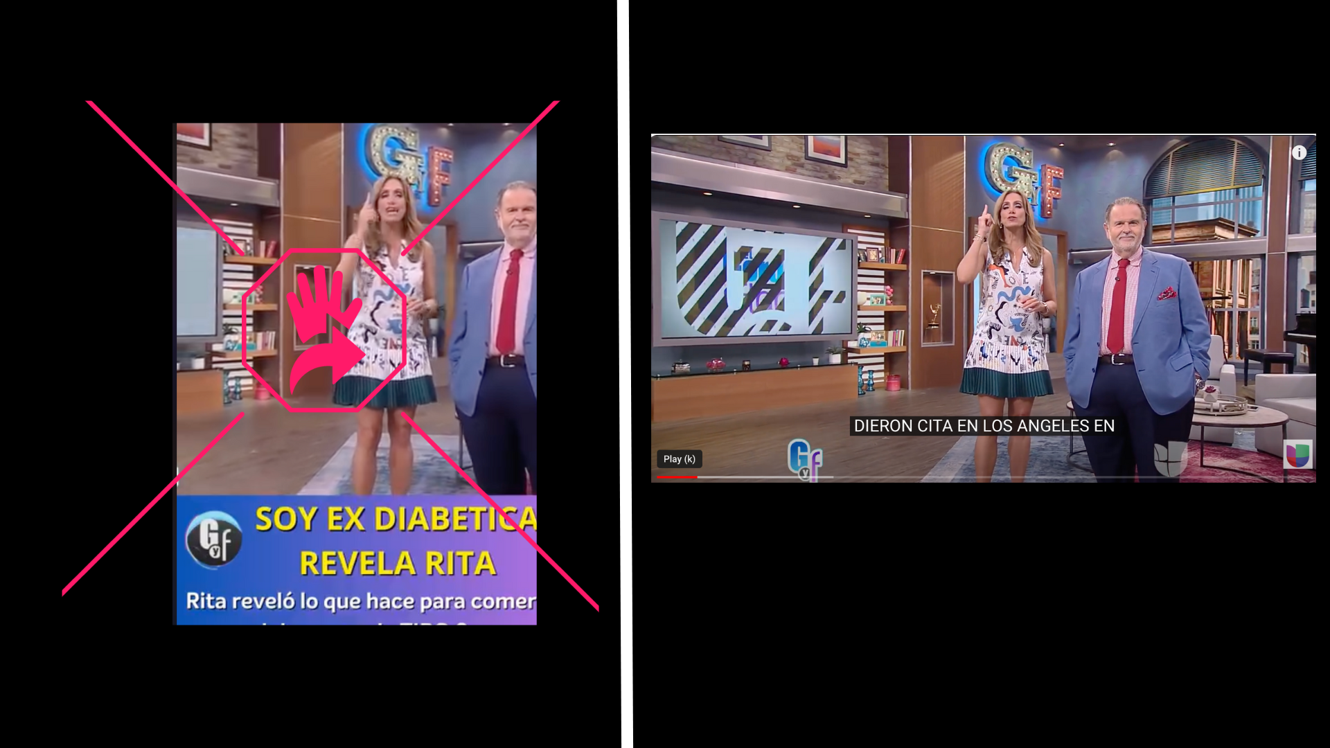 Por ejemplo, en ninguna parte de la grabación original se observa el texto que incluye el video desinformante en la parte inferior, y tampoco se escucha ni a Estefan ni a Moreno hablar de diabetes o de gotitas para esta enfermedad. Al contrario de lo que intenta mostrar el clip manipulado, la entrevista a la artista tenía como enfoque un reconocimiento que le hicieron en California y el secreto para mantenerse bien a sus entonces 84 años.